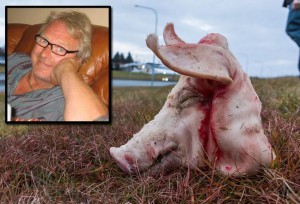Imagen de la cabeza del cerdo aparecido en el solar donde se construirá la primera mezquita de Islandia. En el recuadro superior, el sueco Óskar Bjarnason