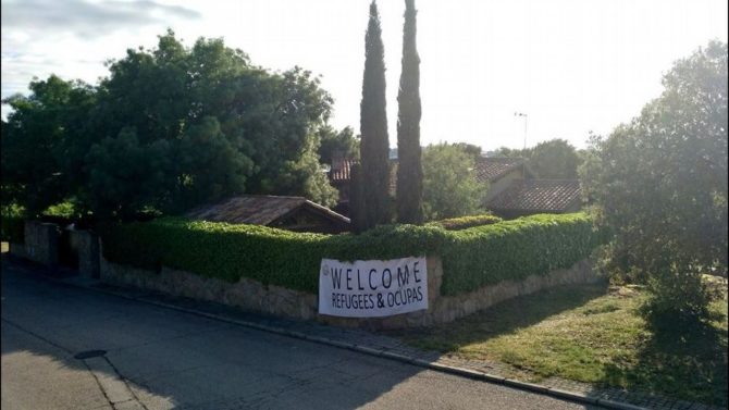 Imagen del chalé de Pablo Iglesias con una pancarta dando la bienvenida a los refugiados.