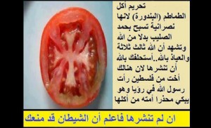 Y prosigue el mensaje: “Imploramos difundir esta foto, ya que una hermana de Palestina ha tenido una visión en la que Mahoma estaba llorando y le pedía a su pueblo no comer tomates. Si no difunden este mensaje, sepan que el diablo será el que los parará”.