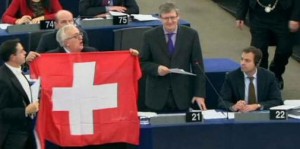 En apoyo al pueblo suizo, el italiano Mario Borghezio (Liga Norte) ha desplegado una bandera helvética en el Parlamento Europeo en medio de un debate sobre las relaciones entre Suiza y la UE despúes del voto sobre la inmigración masiva llevado a cabo hace un par de semanas, con el resultado favorable a la iniciativa popular que tantas reacciones y ampollas han suscitado en medios europeos. (Pinche aquí para ver el video)