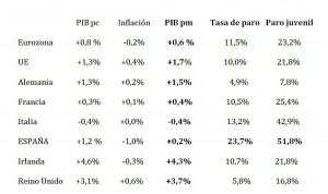 La primera columna, ‘PIB a precios constantes’, es la que manejan Gobierno, Comisión y FMI (que jamás ha dado una en sus previsiones), porque es la empleada para realizar comparaciones internacionales, pero al sobrevalorar los precios no mide la riqueza creada, y las diferencias cuando la deflación es profunda, como es nuestro caso, resultan enormes, tanto como un 1%. Pero aun utilizando un PIB que no mide la creación de riqueza, España no es la que más “crece” de la UE ni de lejos.