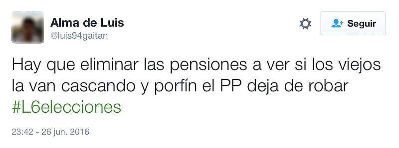 – Los putos viejos que no salen de casa no ven lo que hay y no saben lo mal que lo hace el puto PP que puta rabia.-Qué ganas de que pasen 20 años y se mueran los putos viejos que siguen votando al pp la verdad