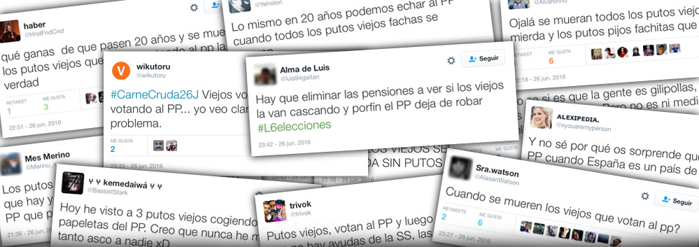 Docenas de ultras de izquierdas, muchos de ellos simpatizantes de Unidos Podemos, se han puesto a insultar a los ancianos llamándoles “putos viejos” y otros insultos, y atribuyéndoles en exclusiva la victoria del PP en estas nuevas elecciones. En esto ha quedado “la sonrisa de un pueblo” que algunos predicaban… Reproducimos literalmente algunos de los comentarios vertidos estos días en las redes sociales y que, como era de esperar, no han sido condenados desde Unidos Podemos. Quizás en esa complicidad con los mensajes apelando al odio y a la aniquilación de un sector de la población española encuentren la mejor razón del por qué serán rechazados por una aplastante mayoría de españoles: