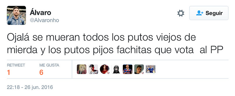 – Hoy he visto a tres putos viejos cogiendo papeletas del PP. Creo que nunca he mirado con tanto asco a nadie xD.