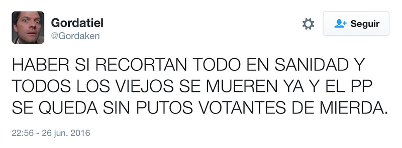 – Putos viejos de mierda y catetos de pueblo votando al PP, siguen hipotecando nuestro futuro, a ver si la palman ya.