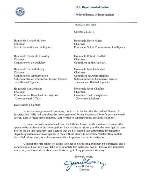 «Estoy de acuerdo en que el FBI debe tomar medidas de investigación apropiadas para permitir a los investigadores revisar estos mensajes de correo electrónico con el fin de determinar si contienen o no información clasificada, así como para valorar su importancia para nuestra investigación», agregó el director del FBI.