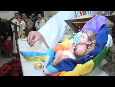 Ignoró sin embargo un detalle muy importante: cometió una ofensa gravísima al Niño Jesús al recostarlo sobre una bandera del lobby gay. Al lado también estaba una pequeña barca de papel simbolizando la llegada de refugiados. O sea, el Niño Jesús es ultrajado con la muestra de la invasión musulmana de Europa y el ataque contra la base de la sociedad que es la familia natural.