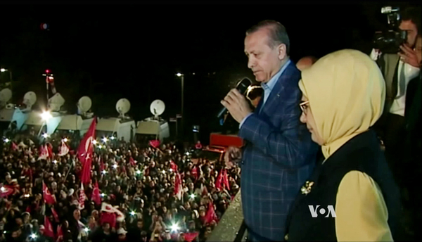 “El presidente de Turquía, Recep Tayyip Erdogan, proclama su victoria en el referéndum del 16 de abril ante una multitud de seguidores”. (Imagen tomada de un vídeo de VOA).