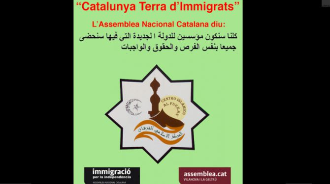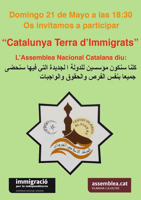 La Asamblea Nacional Catalana (ANC) celebrará el próximo domingo la charla “Catalunya, tierra de inmigrantes” en la mezquita Al Furkan de Vilanova i la Geltrú. La agrupación de la Asamblea en este municipio anuncia el acto en twitter afirmando que “todos seremos fundadores de un Estado nuevo en el que disfrutaremos de los mismos derechos, oportunidades y deberes”. Así se puede leer en un cartel escrito en árabe y que lleva el logotipo de la sectorial de inmigración de la ANC, según cuenta E-noticias.