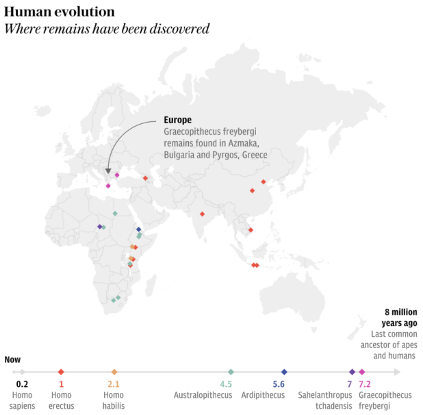El descubrimiento de la criatura, llamada Graecopithecus freybergi, y apodado “El Graeco” por los científicos, demuestra que nuestros antepasados ??ya estaban empezando a evolucionar en Europa 200.000 años antes del primer homínido africano.