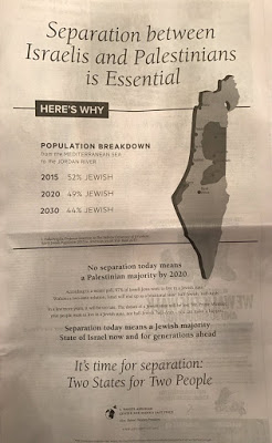 22 de septiembre del 2016. En New York Times apareció a toda página la siguiente imagen (a la izquierda), una llamada de atención a los judíos por parte de la organización liberal sionista Daniel S. Abraham Center for Peace, para mantener la segregación étnica dentro del estado de Israel. Además indicaba el problema demográfico al que se enfrenta Israel en un futuro próximo.