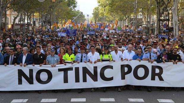 Nueve días después de los atentados de Barcelona y Cambrils (Tarragona), manifestación, bajo el lema “No tinc por” (No tengo miedo). En la cabecera 75 representantes de todos los cuerpos policiales, servicios de emergencias, comerciantes y vecinos que atendieron a los heridos en los primeros momentos del ataque. En una segunda línea, el Rey, el presidente del Gobierno y la práctica totalidad de su Ejecutivo, el presidente catalán, la alcaldesa de Barcelona, los presidentes de todas las comunidades autónomas, líderes de todos los partidos, y una amplísima representación de instituciones, patronales y sindicatos.