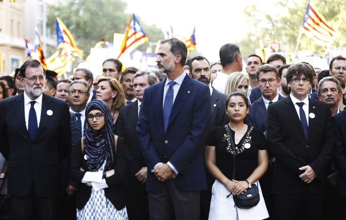 El rey Felipe VI, junto a los presidentes del Gobierno, Rajoy, y de la Generalitat, Puigdemont, durante la manifestación contra los atentados yihadistas en Cataluña.
