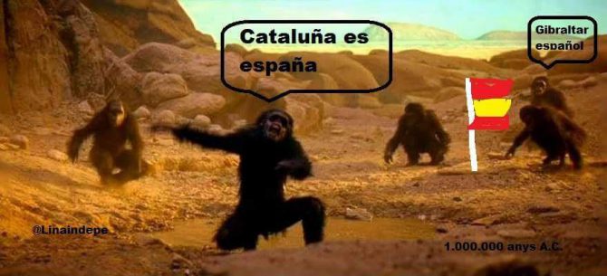 No es la primera vez que este grupo supremacista compara a los monos con los españoles. El pasado 16 de octubre colgaron otro mensaje similar: varios simios aparecían en la imagen alrededor de una bandera nacional, afirmando uno de ellos qu “Cataluña es España” y otro que decía “Gibraltar español”.