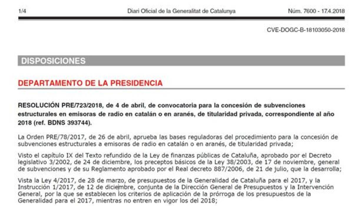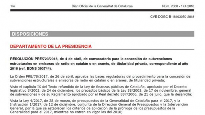 Se trata de dos partidas diferenciadas, televisión y radio. La primera de ellas está dotada con 615.000 euros para «subvenciones estructurales a emisoras de televisión en catalán o en aranés de titularidad privada, correspondiente al año 2018».