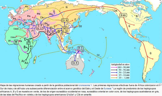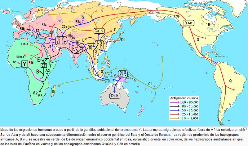 La distribución de los haplogrupos ancestrales refuerzan la teoría del origen de los humanos modernos en el África subsahariana y permiten trazar en forma aproximada las migraciones humanas prehistóricas a partir de África y la sucesiva colonización del resto del mundo