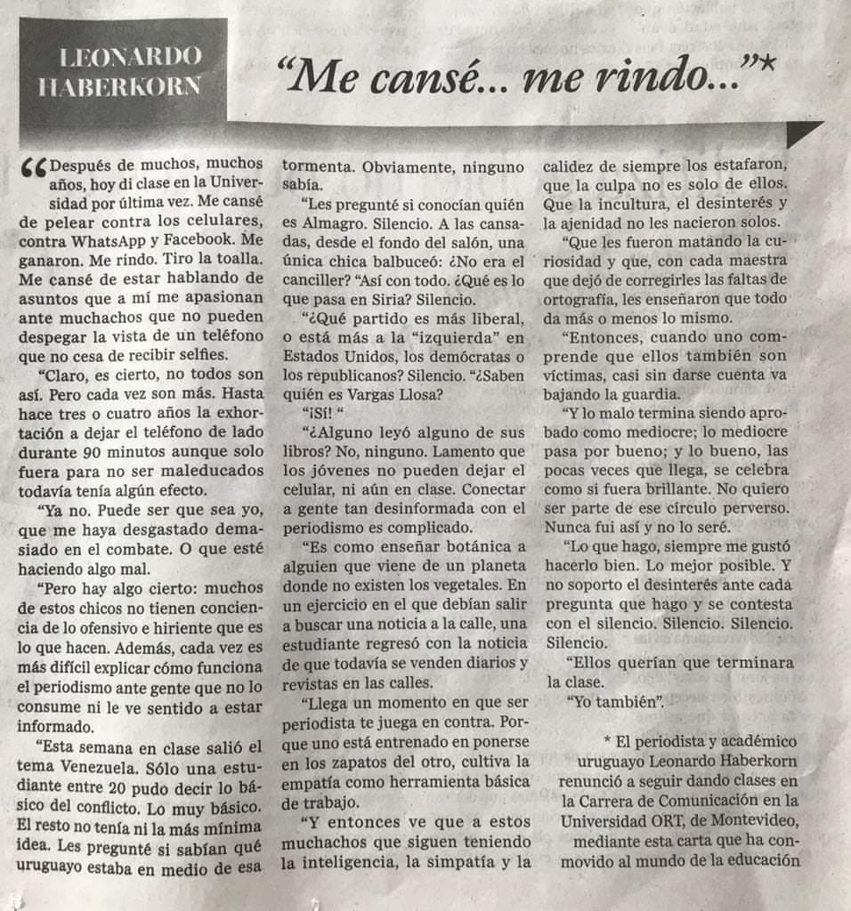 «Después de muchos años», decía Haberkorn, se cansó de la falta de interés de sus alumnos. «Me cansé de pelear contra los celulares, contra WhatsApp y Facebook. Me ganaron. Me rindo. Tiro la toalla. Me cansé de estar hablando de asuntos que a mí me apasionan ante muchachos que no pueden despegar la vista de un teléfono que no cesa de recibir selfies», lamentó el profesor.