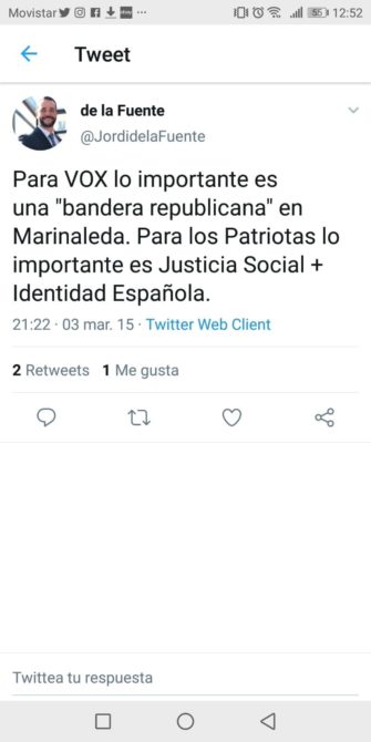 En aquella época, la urgencia de labrarse un futuro político no apremiaba tanto como hoy a Jordi de la Fuente. Tal vez por eso escribió un twitter haciendo mofa de la reclamación del alavés. “Para VOX lo importante es una ‘bandera republicana’ en Marinaleda. Para los Patriotas lo importante es Justicia Social + Identidad Española”, manifestó entonces.