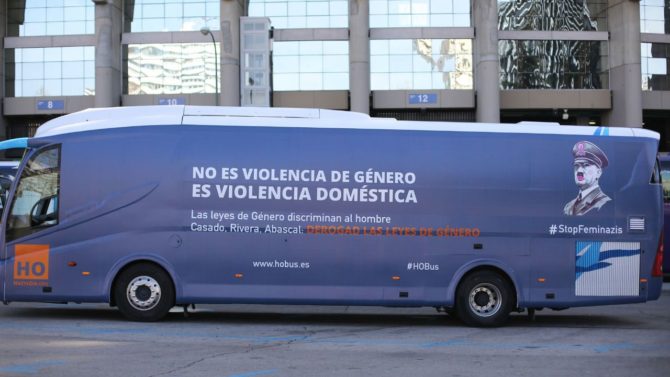 Ya son conocidos los autobuses con mensajes duros hacia ciertos grupúsculos sociales como la comunidad LGTBI (uno de los mensajes que les llevó a la popularidad decía: “Los niños tienen pene; las niñas tienen vulva. Que no te engañen. Si naces hombre, eres hombre. Si eres mujer, seguirás siéndolo”). Ahora, a apenas una semana del Día de la Mujer, quieren apoyar el mensaje de Vox con una imagen de Hitler con un símbolo feminista en el gorro y maquillaje en los labios y los mofletes; un nuevo lema: “No es violencia de género, es violencia doméstica”; y un hastag: StopFeminazis.
