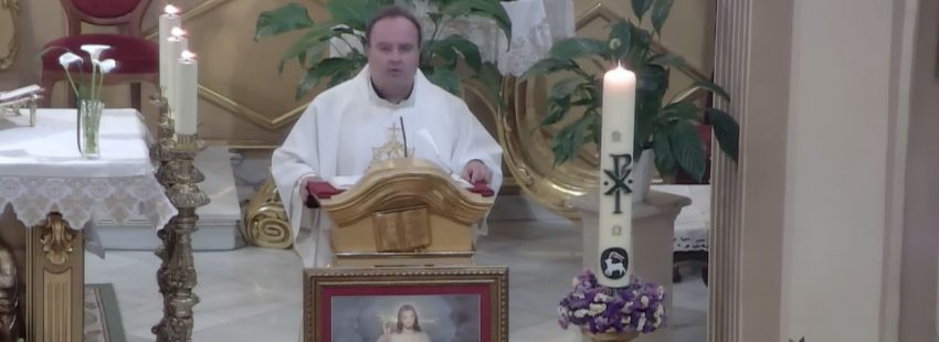Misa del Domingo de la Divina Misericordia. Celebración retransmitida en directo por Telearchena, televisión local de Murcia. El celebrante, el párroco de la localidad y vicario episcopal de Cieza-Yecla (Diócesis de Cartagena), Alfonso Albuquerque. En su homilía, tras poner en valor el trabajo de los sanitarios, el sacerdote entra en materia para, en cinco minutos, cargar contra la supuesta persecución del Gobierno a la Iglesia, el ocultismo con las cifras de fallecidos a causa del coronavirus y el también supuesto espionaje gubernamental a los teléfonos móviles de los españoles, curas incluidos.