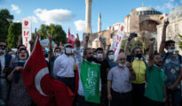 En la imagen: Islamistas celebran el decreto del presidente turco Recep Tayyip Erdogan, por el que la histórica catedral cristiana de Santa Sofía vuelve a convertirse en mezquita, en el exterior de Santa Sofía...