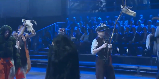 En el Ofertorio varios personajes, vestidos de forma muy extraña, presentan sus dones al ángel. Llaman la atención una calavera de cabra y UN CORDERO MUERTO. Pero claro, la BBC no tendrá ni idea de qué va eso.
