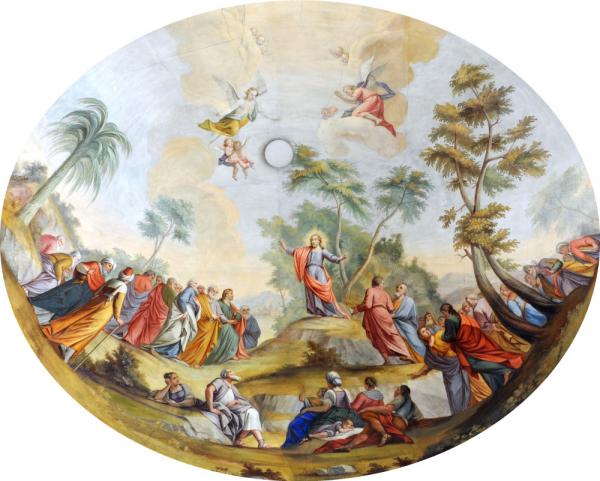 El Sermón de Jesús en el Monte. Fresco de Franz Xaver Kirchebner en la iglesia parroquial de St. Ulrich en Gröden-it, Ortisei construida a finales del siglo XVIII. (Imagen: Wikimedia/Commons)