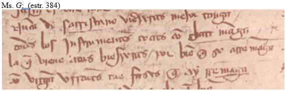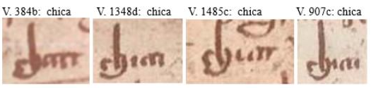 Corominas (1967) nos sorprende, como acostumbra, con una imaginativa lectura: «todos los estrumentes tocas con artemanga». Sin explicar la razón por la que elige esa extraña variante de instrumentos, que no se encuentra en ninguno de los manuscritos, argumenta con detalle su lectura artemanga diciendo: «yo leo bien claramente [en un microfilm del ms. G] con hart mãga, o sea con arte manga, […] Estamos ante una variante de la palabra artimaña […] que es ‘artificio para engañar’, […] ‘sabiduría’, […] o ‘magia’ […]». Pero debemos contestar al sabio Corominas que arte se escribe sin hache, tanto ahora como en la Edad Media, y que tal variante no está documentada, por lo que su viejo microfilm debía de carecer de calidad. En el manuscrito no existe ningún parecido gráfico entre chica y arte. Vamos a ver la imagen de la palabra chica del verso 384b comparada con otras similares de otros tres versos y con cinco ejemplos de la palabra arte, de los muchos que se podrían poner, todos ellos sin hache. Como puede verse, no hay confusión posible entre ambos términos.