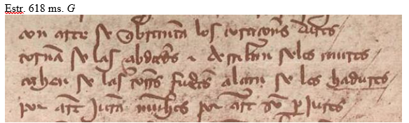 Entramos ya de lleno en el hemistiquio que incluye la misteriosa palabra haduros, y que, como vemos por comparación con el verso del Pamphilus, debería de significar ‘carga’. El problema es que tal palabra no está documentada, razón por la cual el copista del ms. S, que evidentemente no la reconocía, optó por la vía fácil – que tantas veces había empleado en la elaboración de su mixtificador texto- de sustituir «álçanse los haduros» por «alçan pesos duros» , cometiendo con ello dos irregularidades: por un lado hizo al hemistiquio hipométrico y por otro -el verdaderamente grave- repitió la palabra duros que remataba el primer verso, error imperdonable para un poeta de la categoría del Arcipreste, por lo que podemos estar seguros de que para reconstruir el arquetipo perdido debemos partir de la lectura del ms. G, obra de un copista que prefería reproducir fielmente el texto ininteligible que tenía ante sus ojos antes que falsificarlo. Pero antes de explicar el significado de esta palabra veremos lo que los principales editores del Libro han transcrito y anotado al respecto a lo largo de la historia.