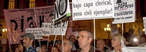 Todo tipo de pancartas, como “Papa o califa, paguen sus visitas”, “Ni Papa ni PP”, “Niños venid, de los curas huid” o “El condón salva, emPaparse enferma” han probado la heterogeneidad de esta concentración, que ha reunido a 74 asociaciones laicas catalanas.