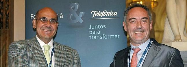 El cocinero Ferrán Adriá (d) y el secretario general técnico de presidencia de Telefónica, Luis Abril, durante el acto en el que han presentado el acuerdo por cuatro años por el que el chef pasará a ser el embajador de la marca Telefónica en todo el mundo.