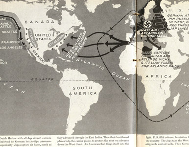 Varios mapas relatan cómo las potencias del Eje podrían combinar sus esfuerzos, centranse en América, y apoderarse de EE. UU. Los mapas de este tipo con flechas fueron difundidos por todo Estados Unidos y eran muy frecuentes durante esta época.