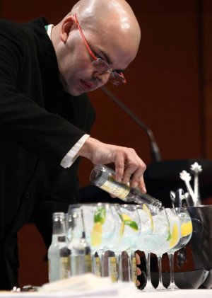 Vi el video en otra web y es realmente impresionante, el cuidado y esmero en prepararlo. Eso sí, yo particularmente, y más con la ginebra que usó (London nº1, bastante seca), prefiero schweppes a la empleada en el concurso. A mi entender combina mejor, sin querer discutir al maestro!