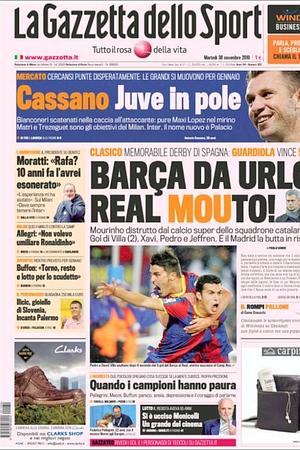 En Italia, ‘La Gazzeta dello Sport’ se centra en el ex técnico del Inter, José Mourinho. “Un Barça divino”, titulan y aseguran que Mourinho pudo ver la exhibición azulgrana con los cincos goles encajados. El portugués sigue siendo muy mediático en todo el planeta. Por su parte, ‘Il Corriere dello Sport’, abre su portada con el clásico español. El rotativo italiano califica al Barça de ‘maravilla’ y al igual que ‘Tuttosport’ dicen que el técnico portugés resultó humillado. Otros titulares de la prensa italiana: Un batacazo vergonzoso” (Corriere della sera),”Mou, humillación especial. El Barcelona destroza al Real Madrid” (La Repubblica).
