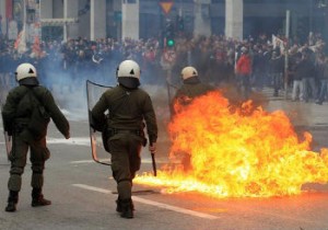 Los manifestantes griegos se han enfrentado con la policía y han prendido fuego a varios vehículos y un hotel en el centro de Atenas, mientras decenas de miles marchaban contra las medidas de austeridad que buscan sacar al país de la deuda financiera.
