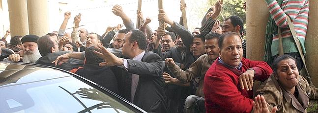 Unos agentes de seguridad impiden que unos cristianos coptos egipcios se abalancen sobre el vehículo que traslada al gran jeque de Al Azhar, Ahmed el-Tayeb, después de la reunión que ha mantenido con el líder de la Iglesia copta, el papa Shenuda III, en El Cairo, para presentarle sus condolencias por el atentado suicida.