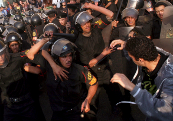 Con gritos como “abajo, abajo, Hosni Mubarak” los manifestantes se han enfrentado a las fuerzas de seguridad y han respondido a los cañones de agua y los gases lacrimógenos lanzando botellas y piedras.