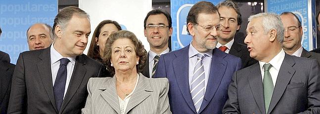 El presidente del PP, Mariano Rajoy (2d), junto al responsable de Política Autonómica, Javier Arenas (d); el de Comunicación, Esteban González Pons, y la alcaldesa de Valencia, Rita Barberá.