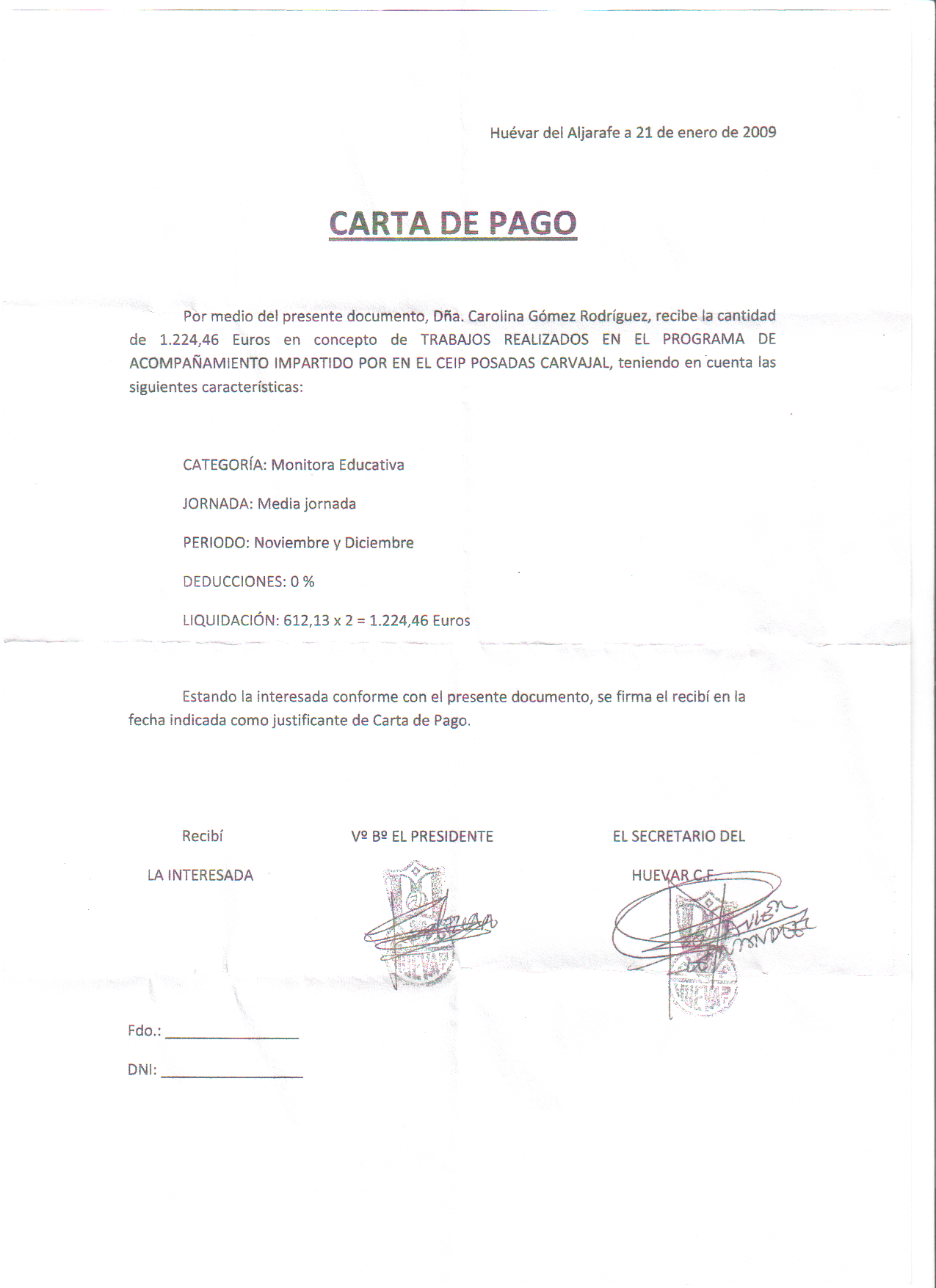 Carolina, aunque no le gustó la idea, tuvo que aceptarla para evitar conflictos con el Alcalde comenzando a trabajar en noviembre de 2009 en el colegio, sin estar dada de alta en ningún momento. El propio concejal de Juventud y Deportes reconoció que tampoco estaban de alta los monitores de deportes. Carolina fue testigo de cómo para pagarle a las demás monitoras el concejal las hacía salir fuera para que nadie viera lo que cobraban ni en qué condiciones. La sorpresa mayor se la llevó esta empleada cuando le pagaron a través del Huévar Club de Fútbol dando pie a una sospecha generalizada del uso de dinero negro en el Club de Fútbol.