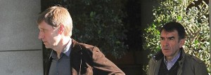 Rufi Etxeberria e Iñigo Iruin, a la entrada del Palacio Euskalduna de Bilbao, donde han presentado el nuevo partido de Batasuna.