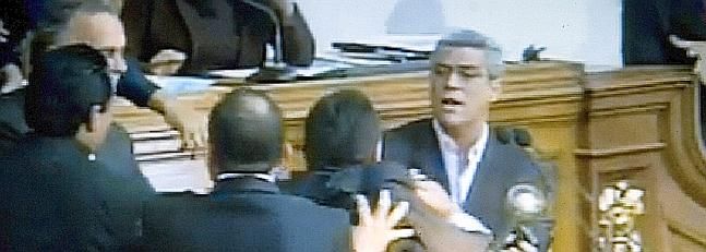 El parlamentario gubernamental Henry Ventura trató de echar del estrado al opositor Alfonso Marquina cuando éste hacía una solicitud al presidente de la cámara, Fernando Soto Rojas. El hecho originó una trifulca transmitida por todo el país a través de radio y televisión.