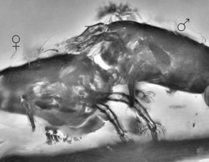 Por ejemplo, en los ácaros modernos el papel dominante pertenece al macho, que hace el cortejo activamente y la guarda antes y después del apareamiento, haciendo frente a los ataques de los competidores. Además, los machos de este arácnido tienen órganos epeciales para aferrarse y ‘sujetar’ a la hembra.