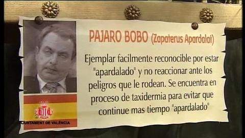 La crisis económica, la corrupción política, la lucha por el poder y la ley antitabaco son algunas de las cuestiones que han convertido a las figuras de Zapatero y Rajoy en las más satirizadas en las fallas de 2011, que hoy viven su segunda jornada de fiesta grande. Así, encontramos a un Rajoy-hechicero haciendo vudú a un muñeco con los rasgos de Zapatero (falla Malvarrosa); a unos ancianos Zapatero y Rajoy jubilándose a los 80 años (plaza del Pilar) y a ambos protagonistas abrazados por una peculiar ley de la gravedad de Newton: personas de polos opuestos se atraen en política (Almirante Cadarso-Conde de Altea).