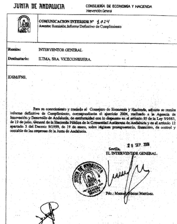En la comunicación aparece la nota “para su conocimiento y traslado al consejero de Economía y Hacienda” y se añade que se adjunta y remite “informe definitivo de cumplimiento” correspondiente al ejercicio 2004 realizado por la Agencia IDEA -que suplió al Instituto de Fomento de Andalucía (IFA)- de conformidad con lo recogido en la ley de Hacienda Pública sobre régimen presupuestario, financiero, de control y contable de las empresas de la Junta de Andalucía.