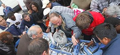 Una avalancha de más de 200 inmigrantes se abalanzó sobre el pescado que nadie quiso en la subasta. «Se comen lo que nadie quiere. Ellos lo aprovechan. Y para tirarlo o que nos lo confisquen, preferimos regalarlo», decía José Ramón Domingo ‘Pepín’, presidente de la cofradía de pescadores.