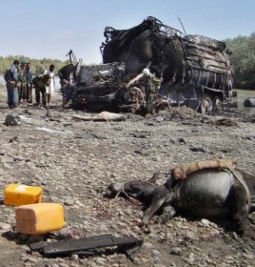 Un corresponsal de la agencia Reuters informa de que cerca de la ciudad vio restos de cuatro vehículos en llamas, incluso un coche de emergencia. Al lado vio algunas sepulturas recientes y gente rezando cerca de las mismas.
