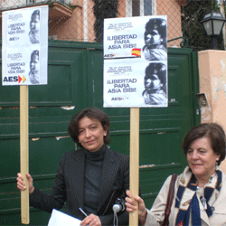 Coincidiendo con la Jornada de Oración convocada por la Santa Sede para rezar por Asia Bibi, la cristiana pakistaní que ha sido condenada a muerte por las autoridades islámicas de aquel país, Valle Piñar y Mar Hurtado, candidatas de Alternativa Española (AES) a la Alcaldía y la Presidencia de la Comunidad de Madrid, respectivamente, se trasladaron hoy hasta la embajada de Pakistán en la capital de España para rezar y pedir la libertad de la condenada. Acompañaban a las dos candidatos numerosos miembros de la formación socialcristiana que lidera el abogado Rafael López-Diéguez.