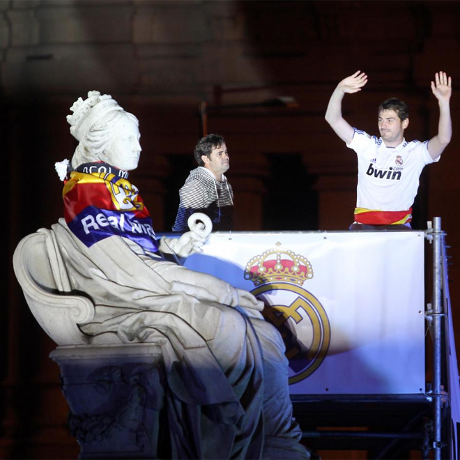 El capitán del Real Madrid, Iker Casillas, ha sido el encargado de coronar a la Diosa Cibeles y ha provocado el éxtasis de los miles de aficionados madridistas congregados en la mítica plaza madrileña, donde los blancos no acudían desde el verano de 2008.