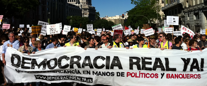 Varios miles de personas se manifiestaron en la tarde del domingo en varias ciudades españolas, convocadas por el movimiento pacífico Democracia real ya, que agrupa a numerosos colectivos, para pedir un cambio político y social, ante la inoperancia del modelo actual. Convocatorias similares se desarrollan también en 50 ciudades para dejar constancia de su indignación porque se considere a los ciudadanos “mercancías en manos de políticos y banqueros”. Ver Mapa de Corrupción por Partidos Políticos