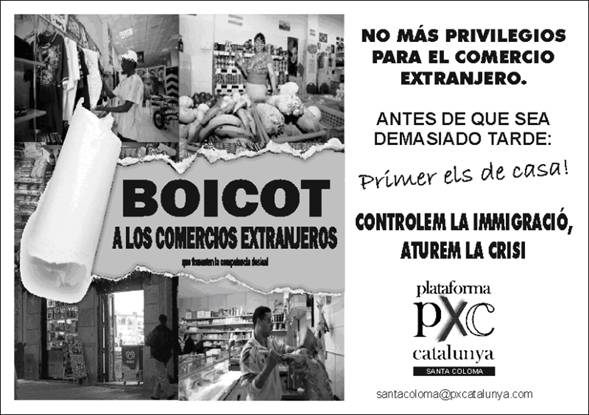La Plataforma per Catalunya (PxC) de Santa Coloma de Gramanet y otros municipios del área metropolitana dan un paso más para proteger los intereses de los comercios autóctonos que cumplen a raja tabla con todas las obligaciones y proponen el boicot a los negocios extranjeros que usan la competencia desleal perjudicando seriamente a los comercios autóctonos.
